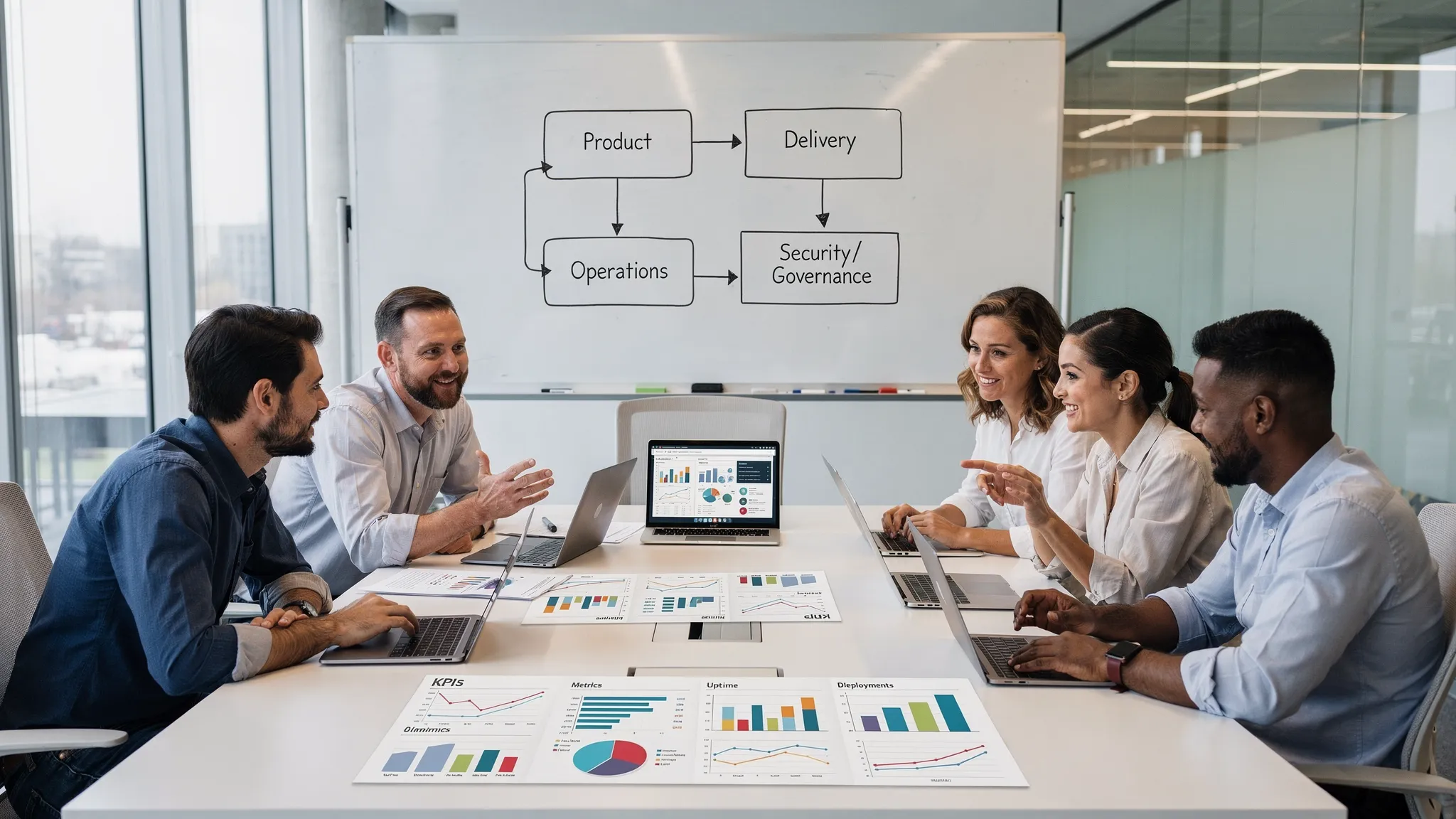 Mérőszámokat és célokat: mit mérünk a flow-ban (szállítás), a stabilitásban (üzem), és a kockázatban (biztonság, megfelelőség).